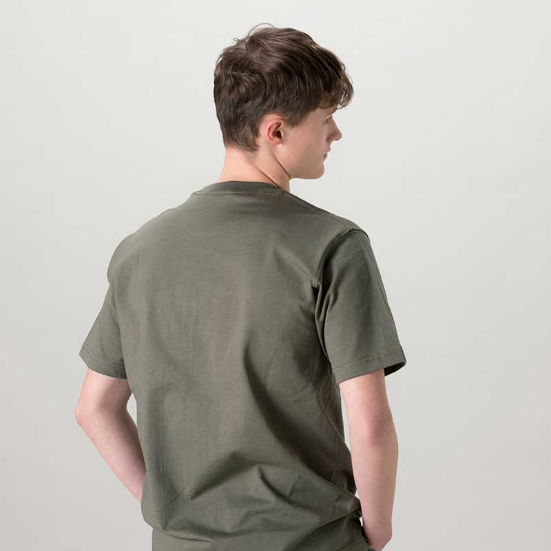 脇に縫い代のない丸胴使用と9OZのしっかりとしたボディを使用しているのも拘りのポイントです。ソフトな肌感を求めるTシャツが多い中あえてオープンエンド糸を使った武骨さがアメリカンスピリットを掻き立てます。