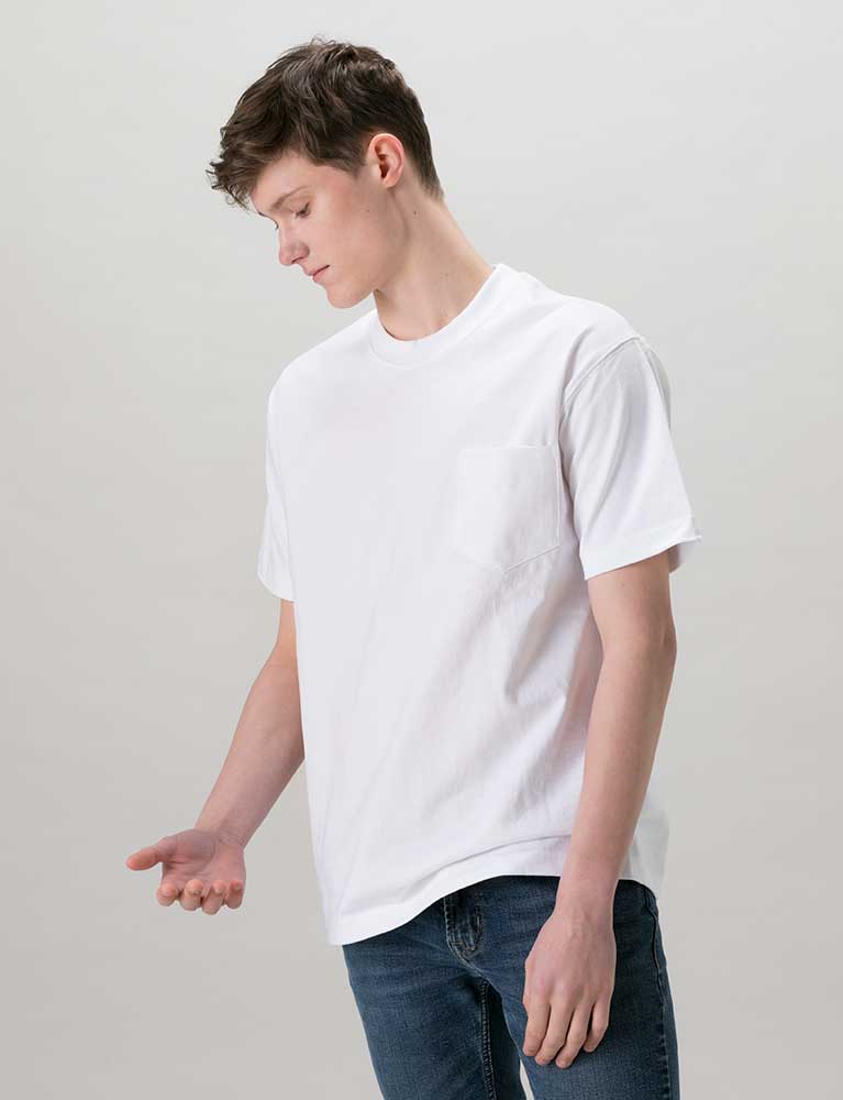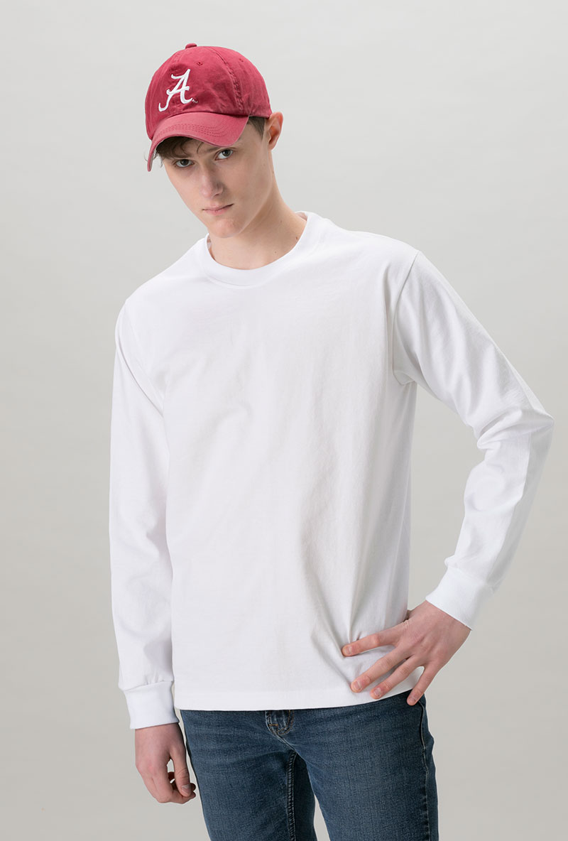 生地の厚さは9ozで生地が厚く、一枚で着ても透けが気になりません。シルエットは身幅を適度にゆったりとさせ、身丈や袖丈はそこまで長くなく、だらしなさはありません。サイドは縫い目のない丸胴にこだわることでストレスも軽減。